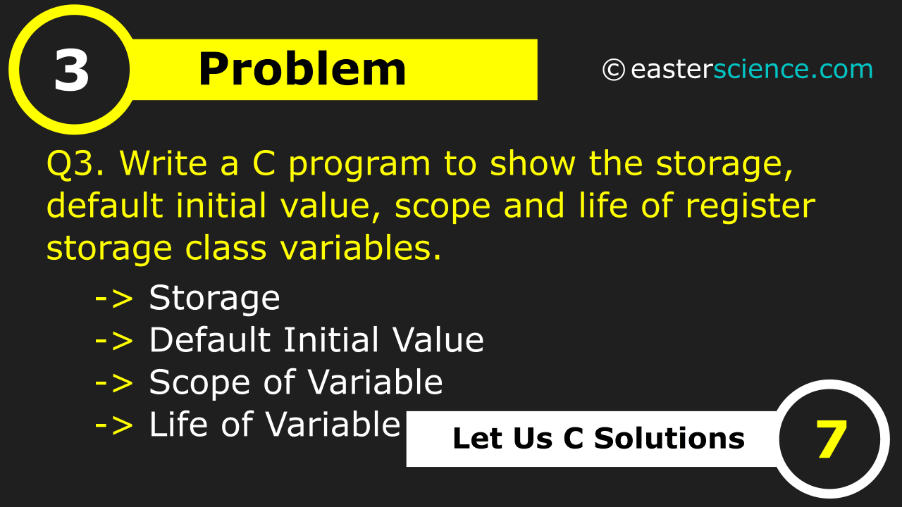 Q3 Write a C program to show the storage, default initial values, scope and life of register storage class variables.